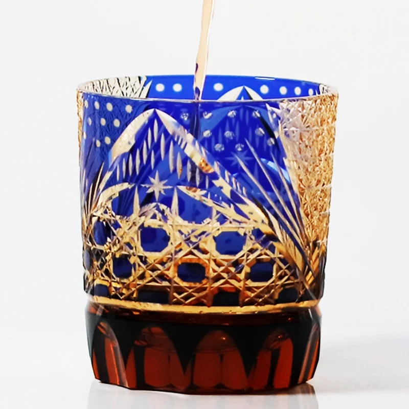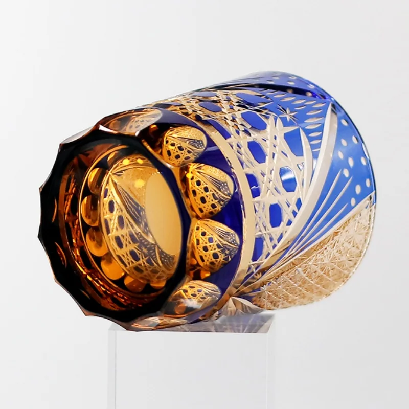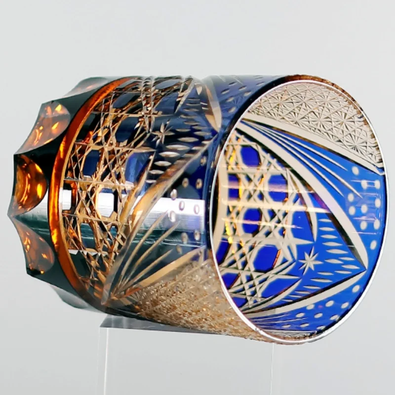 8.5 Oz Luxury Blue Amber Rocks Glass Edo Kiriko Straight Whisky Tumbler Hand Engraved Octagonal Basket Weave with Gift Box