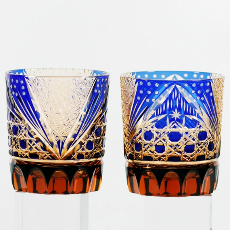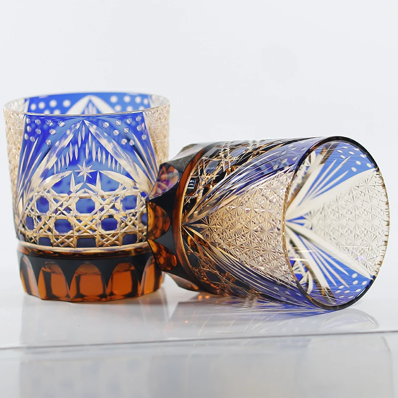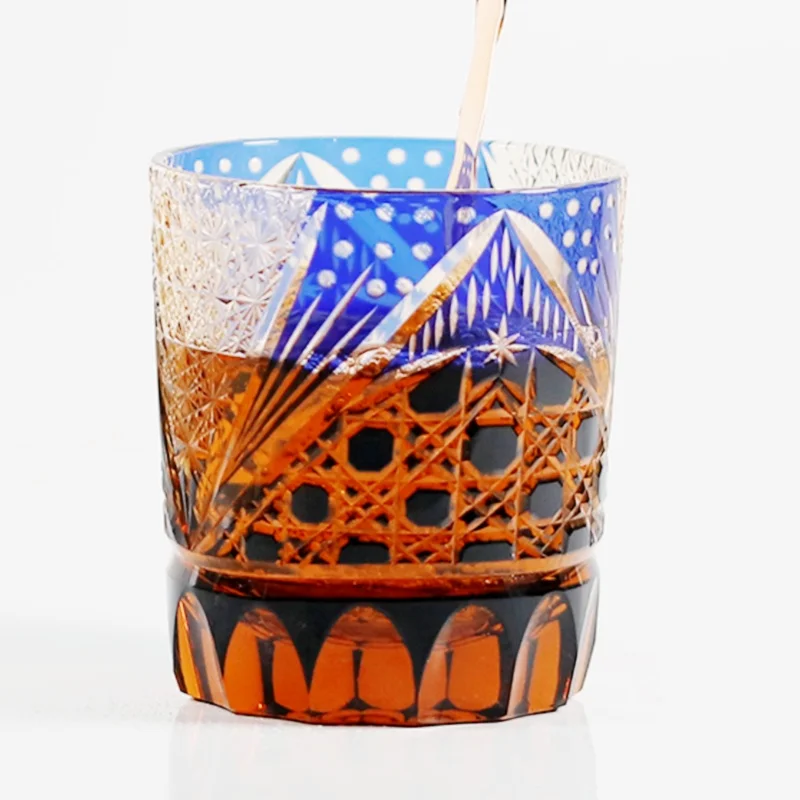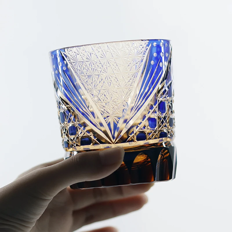 8.5 Oz Luxury Blue Amber Rocks Glass Edo Kiriko Straight Whisky Tumbler Hand Engraved Octagonal Basket Weave with Gift Box